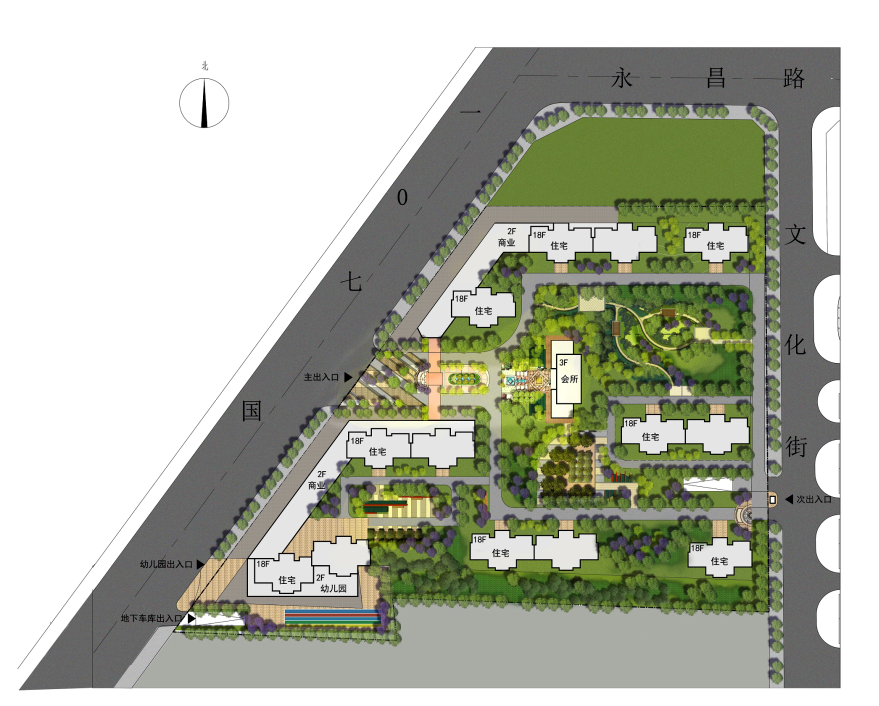 重點打造綜合活動中心、社區(qū)天然氧吧,以中國古典造園手法,即框景、夾景、對景、障景等,結(jié)合現(xiàn)代景觀藝術(shù)手法,實現(xiàn)社區(qū)空間上收放自如、張弛有度。